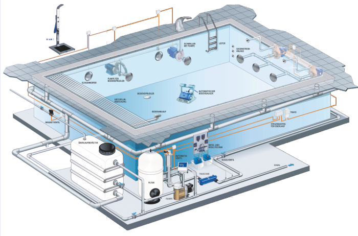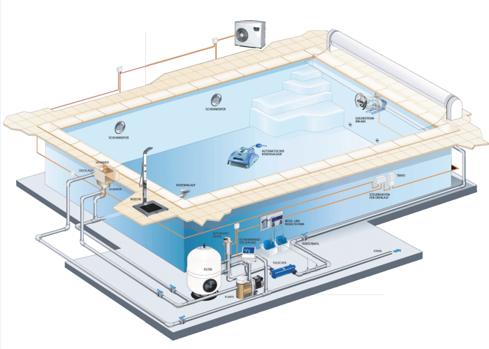 Rysunek przedstawia basen skimmerowy. z lewej strony widać zamontowany skimmer. pompa obiegowa filtra zasysa wodę i tłoczy ją przez filtr basenowy. filtr zbiera zanieczyszczenia znajdujące się w wodzie basenowej, w dalszym biegu znajduje się urządzenie korygujące wartość pH oraz dozujące środki dezynfekcji wody, środek glonobójczy. następnie woda przechodzi poprzez wymiennik ciepła gdzie jest podgrzewana z instalacji co (zamiast wymiennika można zastosować podgrzewacz elektryczny, kolektory słoneczne lub pompę ciepła). Dla wykonania awaryjnego zrzutu wody basenowej i okresowego opróżniania niecki służy odpływ denny. Rurociągi basenowe wykonuje się z rur z twardego PCV ze względu na agresywne działanie środków uzdatniania wody, na rurach montuje się zawory kulowe, nie należy na nich oszczędzać ponieważ przy niedostosowanej ich ilości mogą wystąpić problemy w przypadku jakiejkolwiek awarii urządzenia technicznego. Na rysunku po prawej stronie umieszczono urządzenie przeciwprądu, w momencie budowy warto zamontować zestaw przedmontażowy, a samo urządzenie można zamontować nawet za klika lat.
